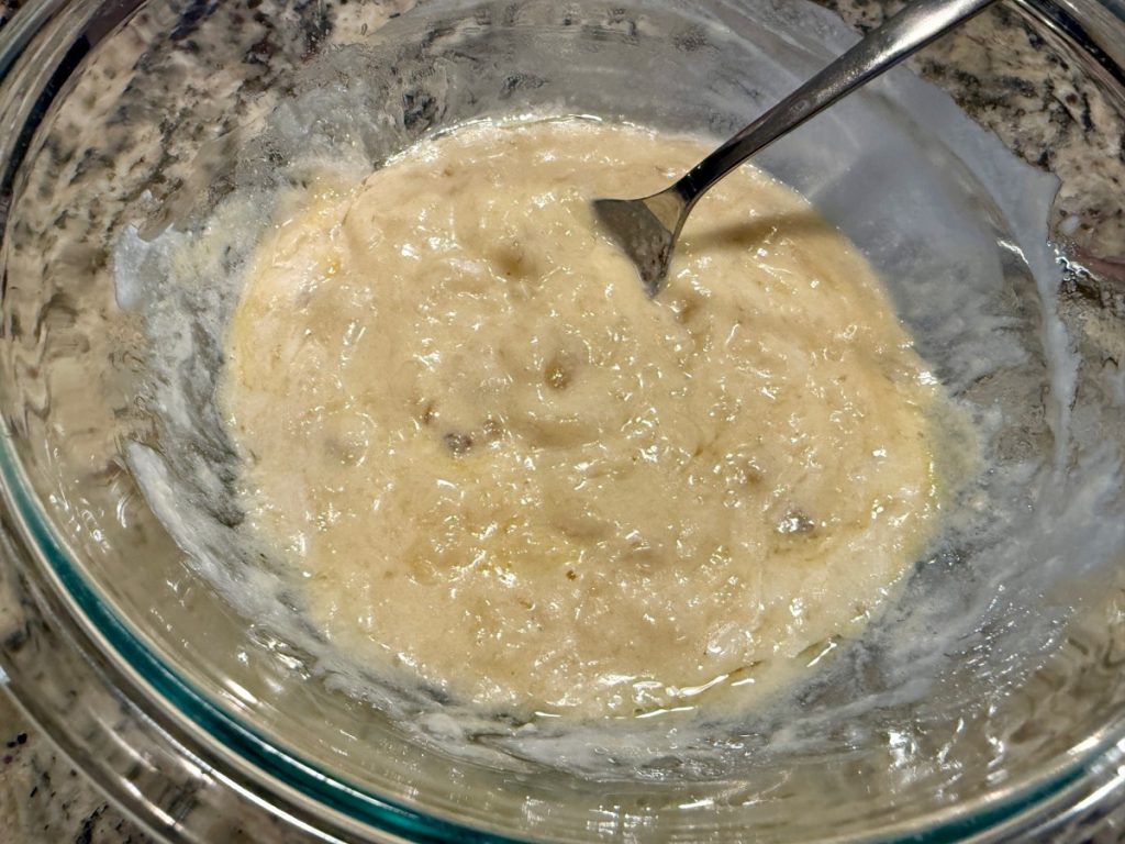 - In a medium bowl, stir together the mashed banana, egg, coconut milk (it should be liquid), and oil.