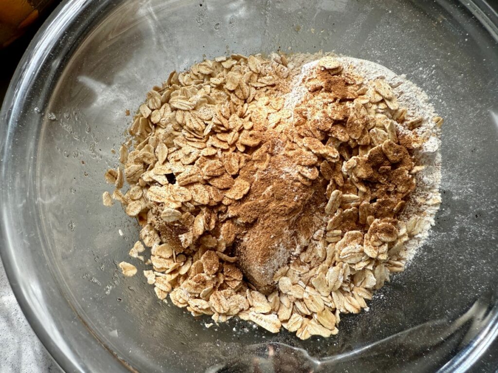- To make the topping, add the browned butter, 1/2 cup of brown sugar, flour, oats, salt, and cinnamon to a small bowl. Use a fork to stir together so everything is moistened.