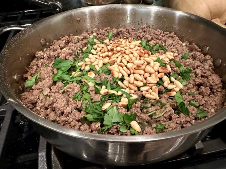- Sprinkle the pine nuts and chopped fresh parsley over the cooked beef. Serve however you'd like...over hummus, rice, on a roasted sweet potato, or whatever else you little heart desires.