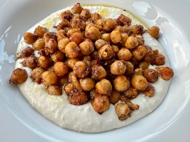 - Spread the feta mixture on a plate and top with the roasted chickpeas. Drizzle with some good olive oil and serve immediately.